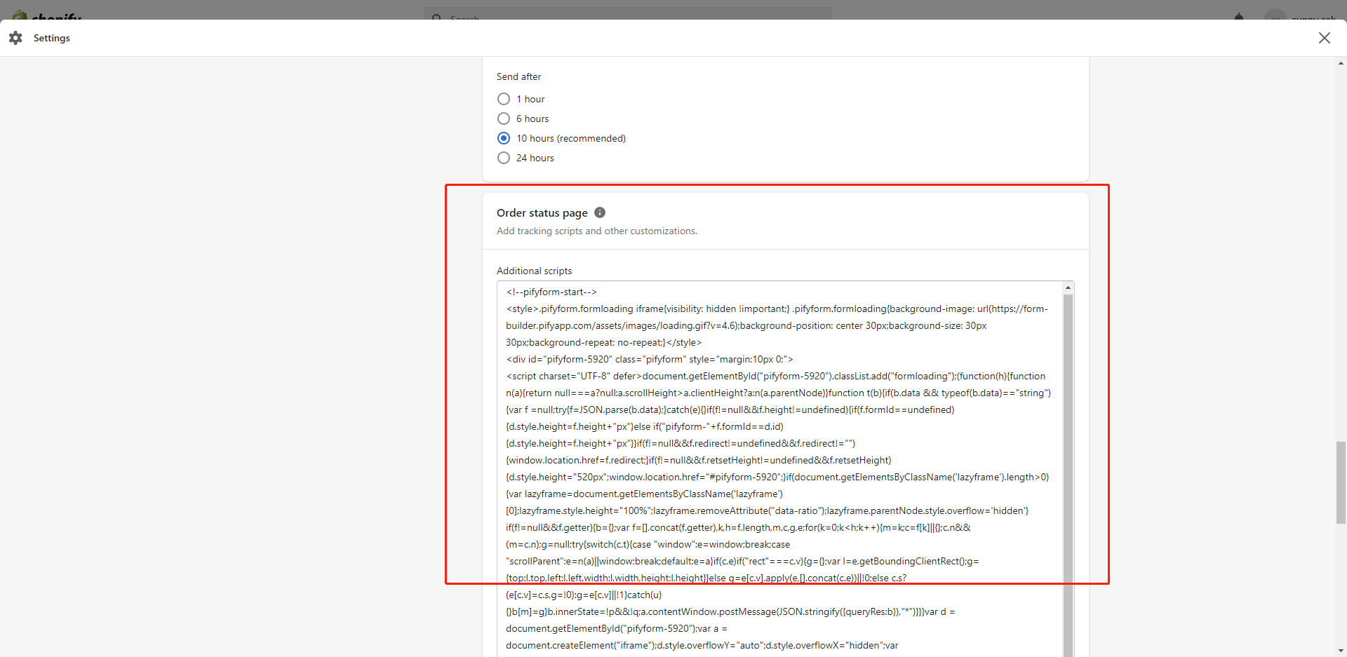 3. On the Order status page section. Paste the form code copied before in the Additional scripts input box.