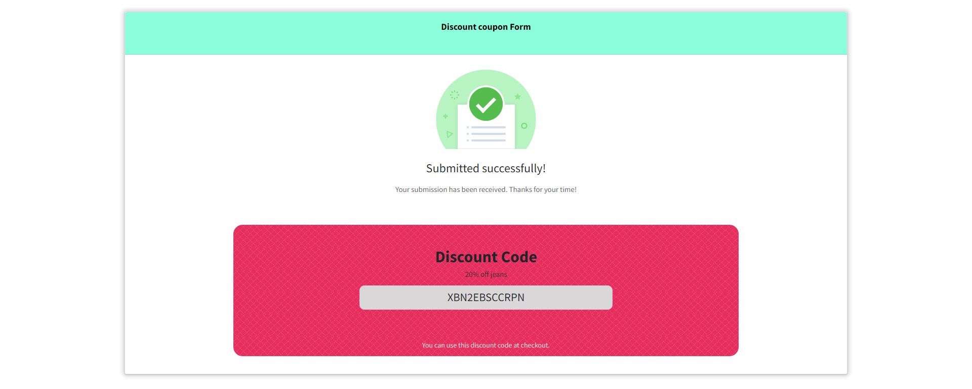 After completion, you can see the discount code on the Successful Tip Message page after submitting the form