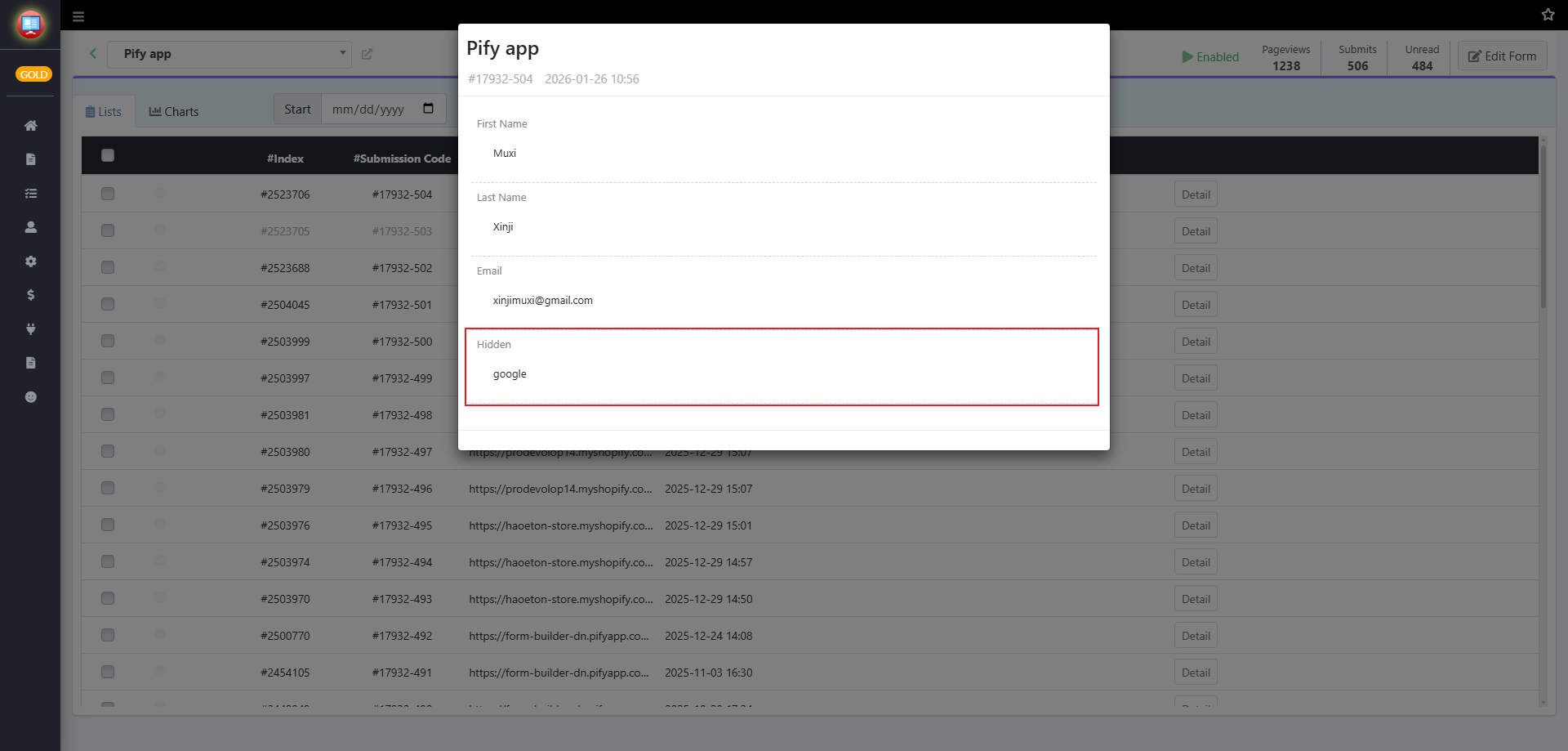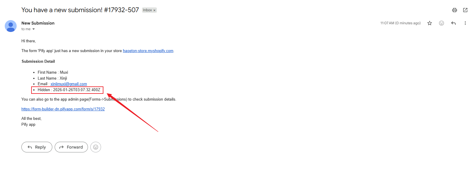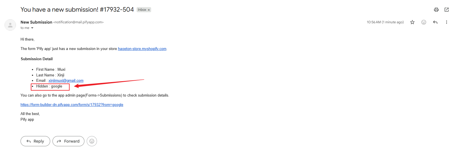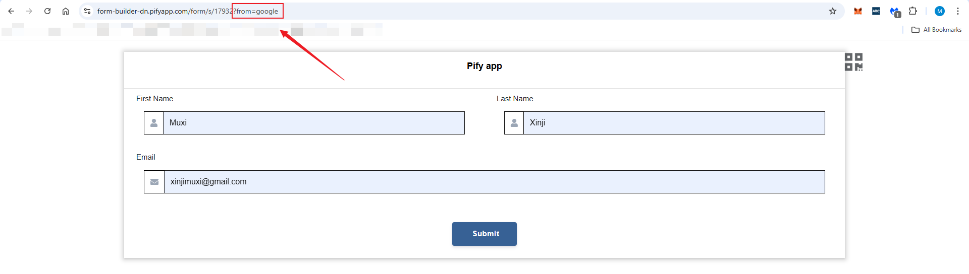 3. After adding it, if the page URL contains the variable from when submitting the form, the form will retrieve the corresponding value. You can view this value in the form's Submissions or in emails.