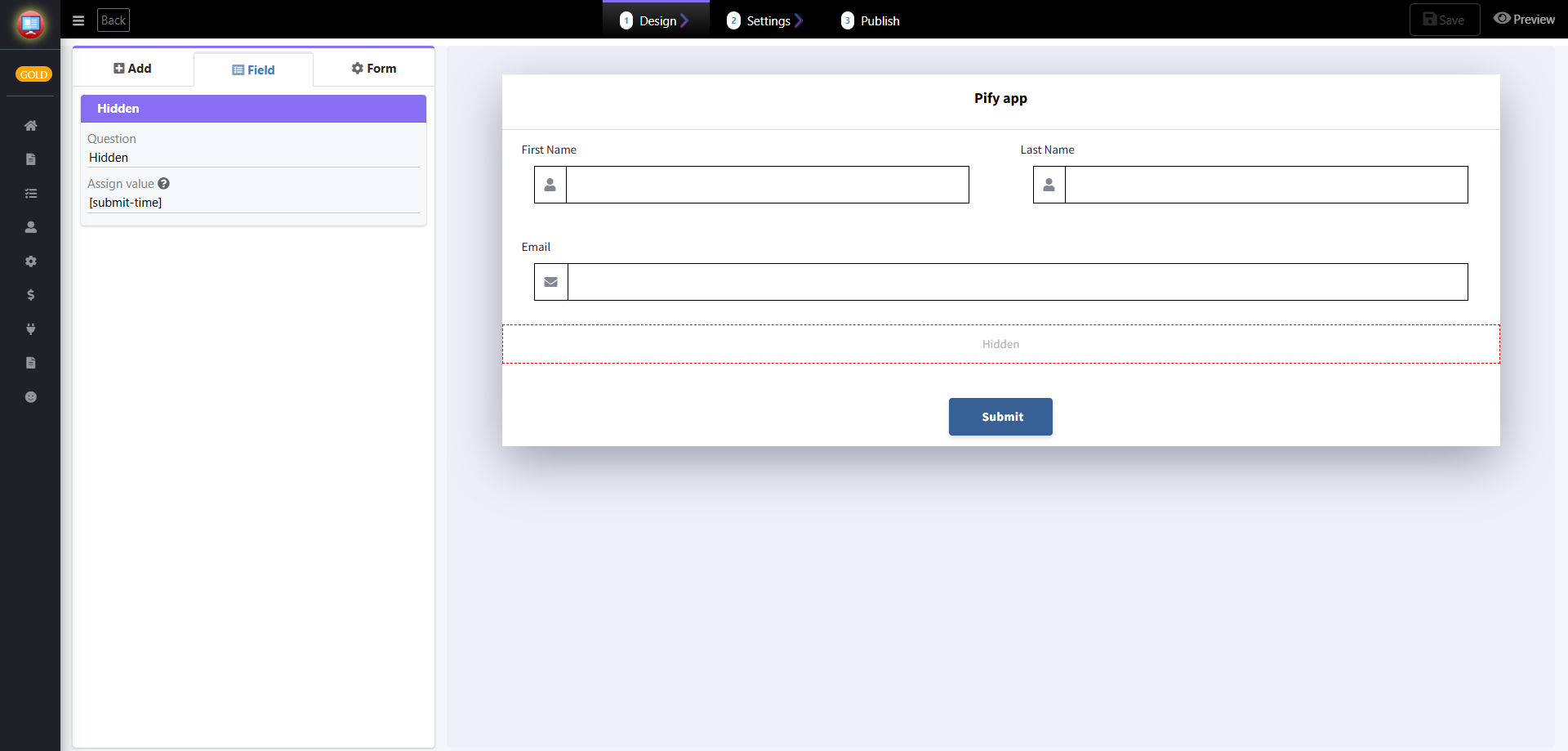 2. Add a Hidden field, then enter the variable "[submit-time]" in the "Assign value" field.